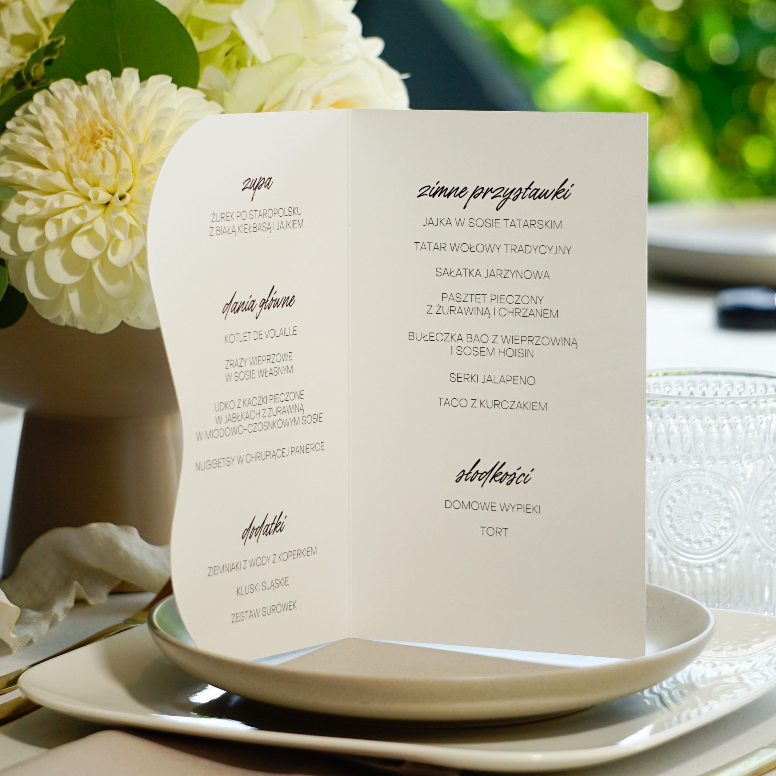 Menu składane w nieregularnym kształcie o wymiarze 12x20cm (po złożeniu).