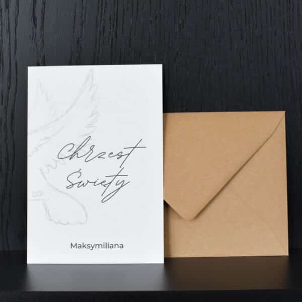 Nowoczesne zaproszenie na Chrzest Święty składane do rozmiaru 12×17 cm z motywem gołębia. Zadrukowane dwustronnie na białym papierze o gramaturze 300g. W zestawie z kraftową kopertą w rozmiarze B6.