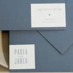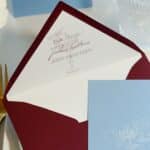 Zaproszenie składające się z karty głównej zadrukowanej dwustronnie na błękitnym papierze o gramaturze 300g. Pierwsza strona zadrukowana białą czcionką, druga strona zadrukowana czcionką w odcieniu bordowym.