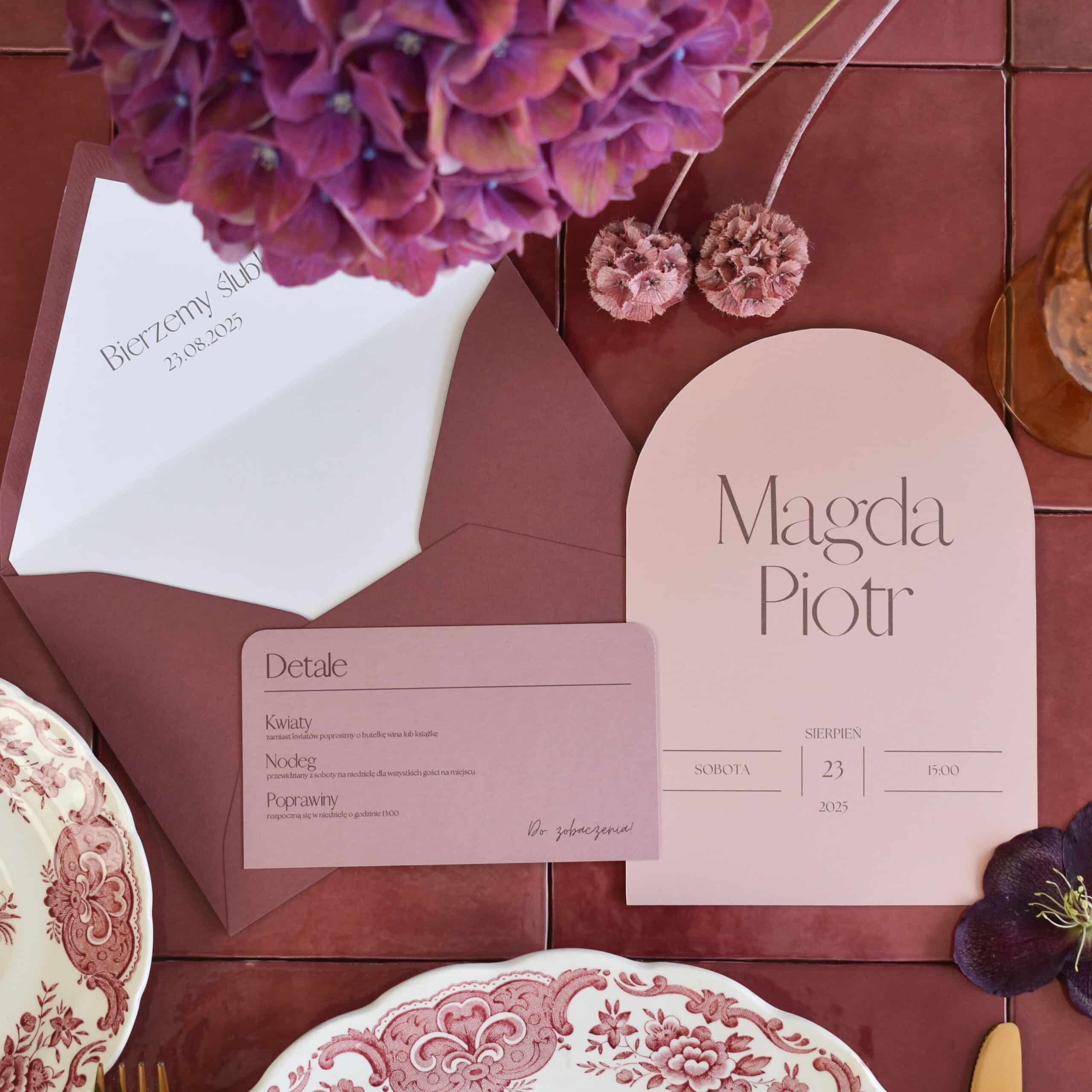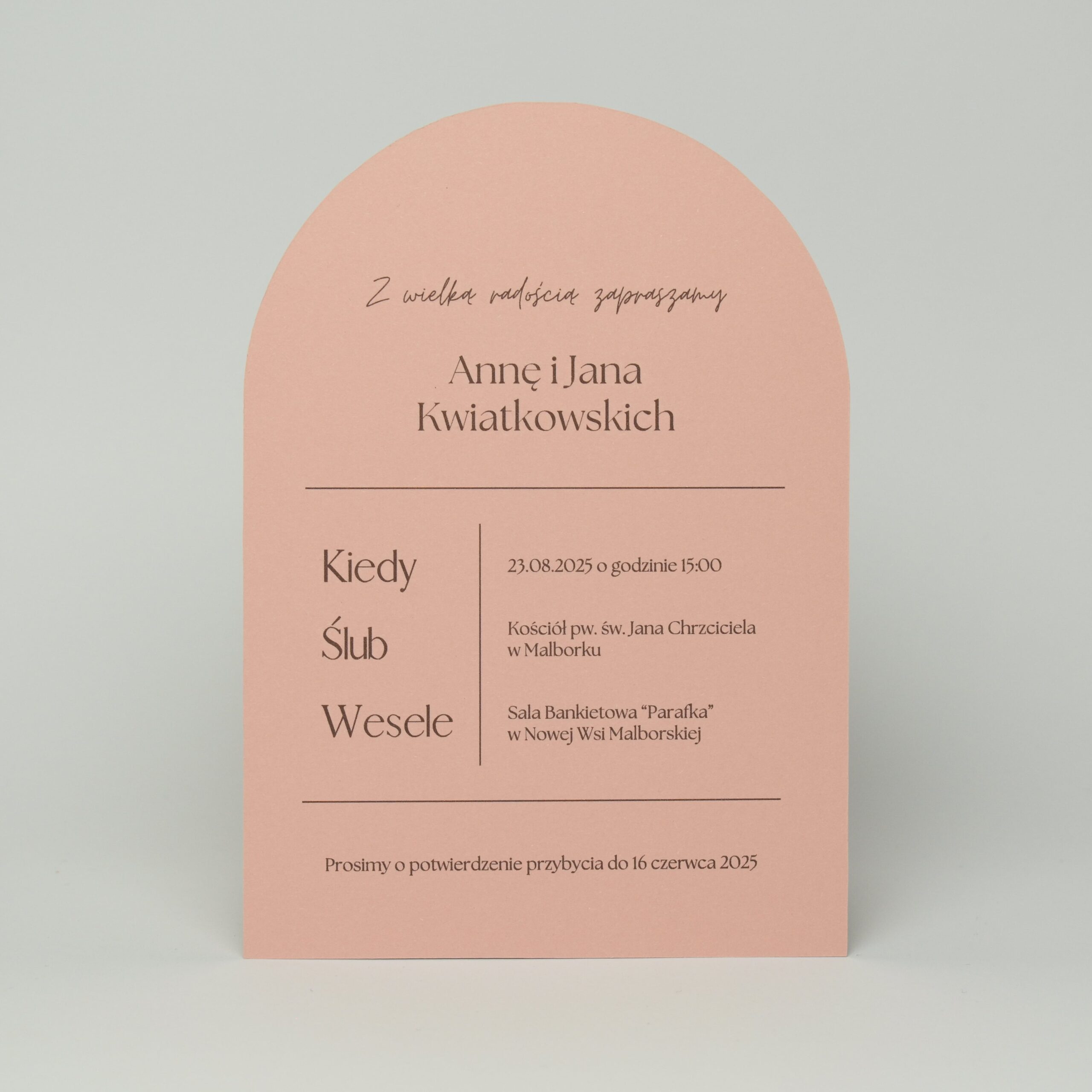Zaproszenie składające się z karty głównej zadrukowanej dwustronnie na bladoróżowym papierze o gramaturze 260g w kształcie łuku. Karta dodatkowa zadrukowana jednostronnie na papierze w odcieniu brudnego różu o gramaturze 300g z zaokrąglonymi górnymi rogami.