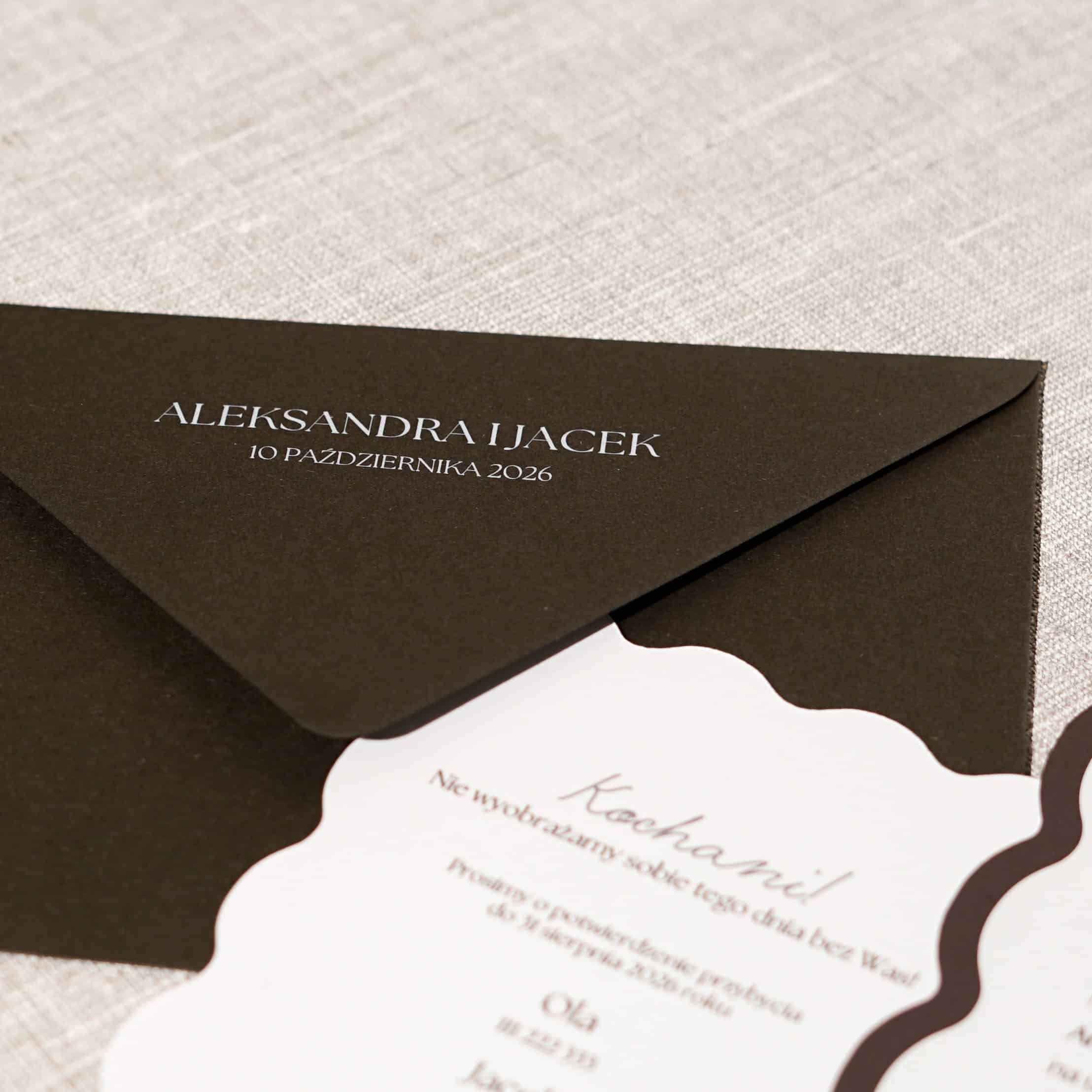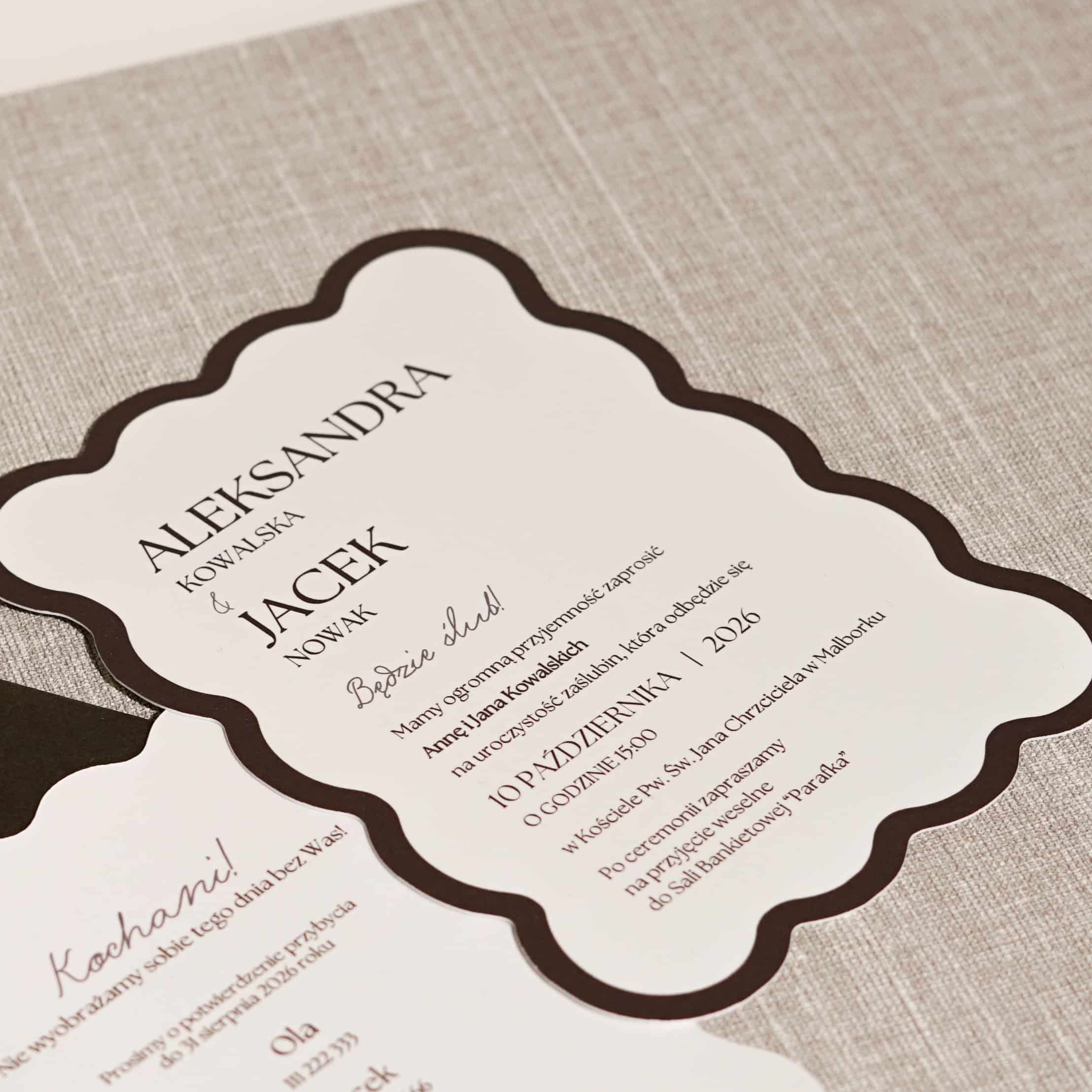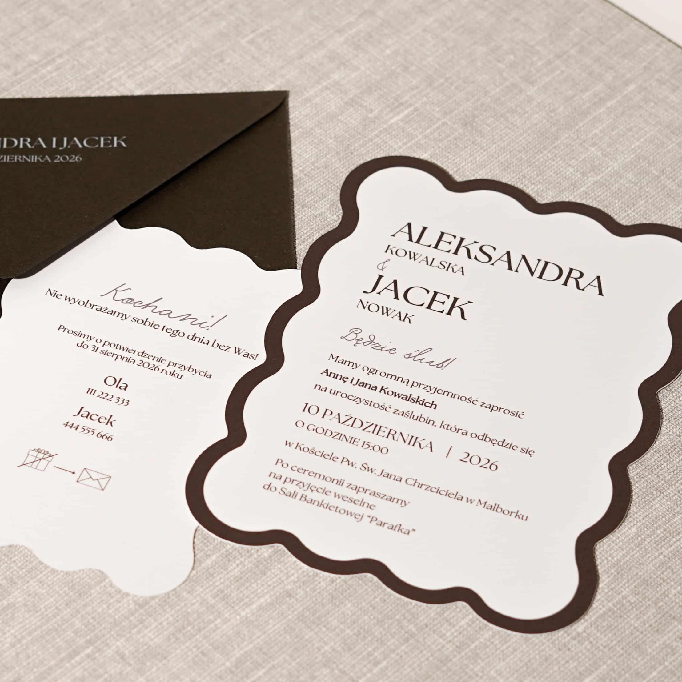 Zaproszenie ślubne składające się z karty głównej w nieregularnym kształcie zadrukowane jednostronnie na białym papierze o gramaturze 300g z krawędzią w kolorze czekoladowym. Do zaproszenia dołączona jest również mniejsza karta zadrukowana jednostronnie na białym papierze 300g. W zestawie z czekoladową kopertą.